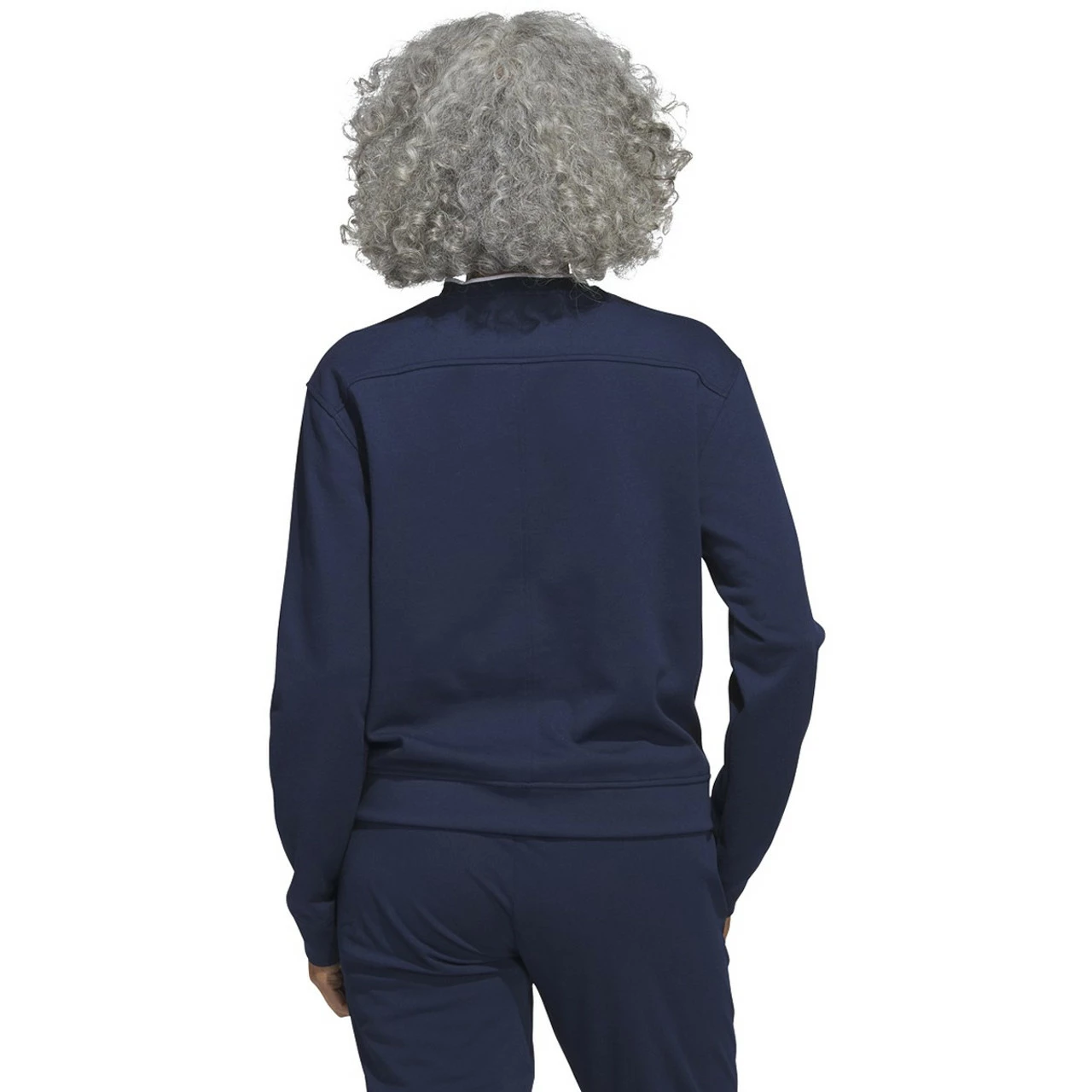 Layer up for cool-weather rounds in this women’s adidas golf sweatshirt. It’s made of a cotton-blend fabric for all-day comfort. Banded sleeves and hem seal out the chill, and a kangaroo pocket warms hands between shots. A minimum of 70% of this product is a blend of recycled and renewable materials.