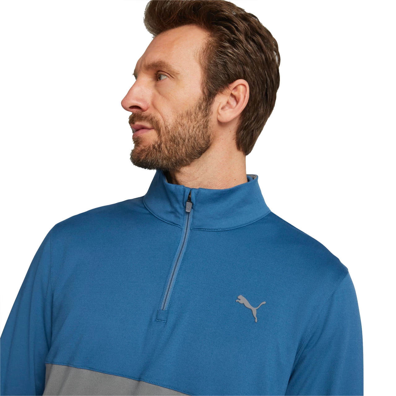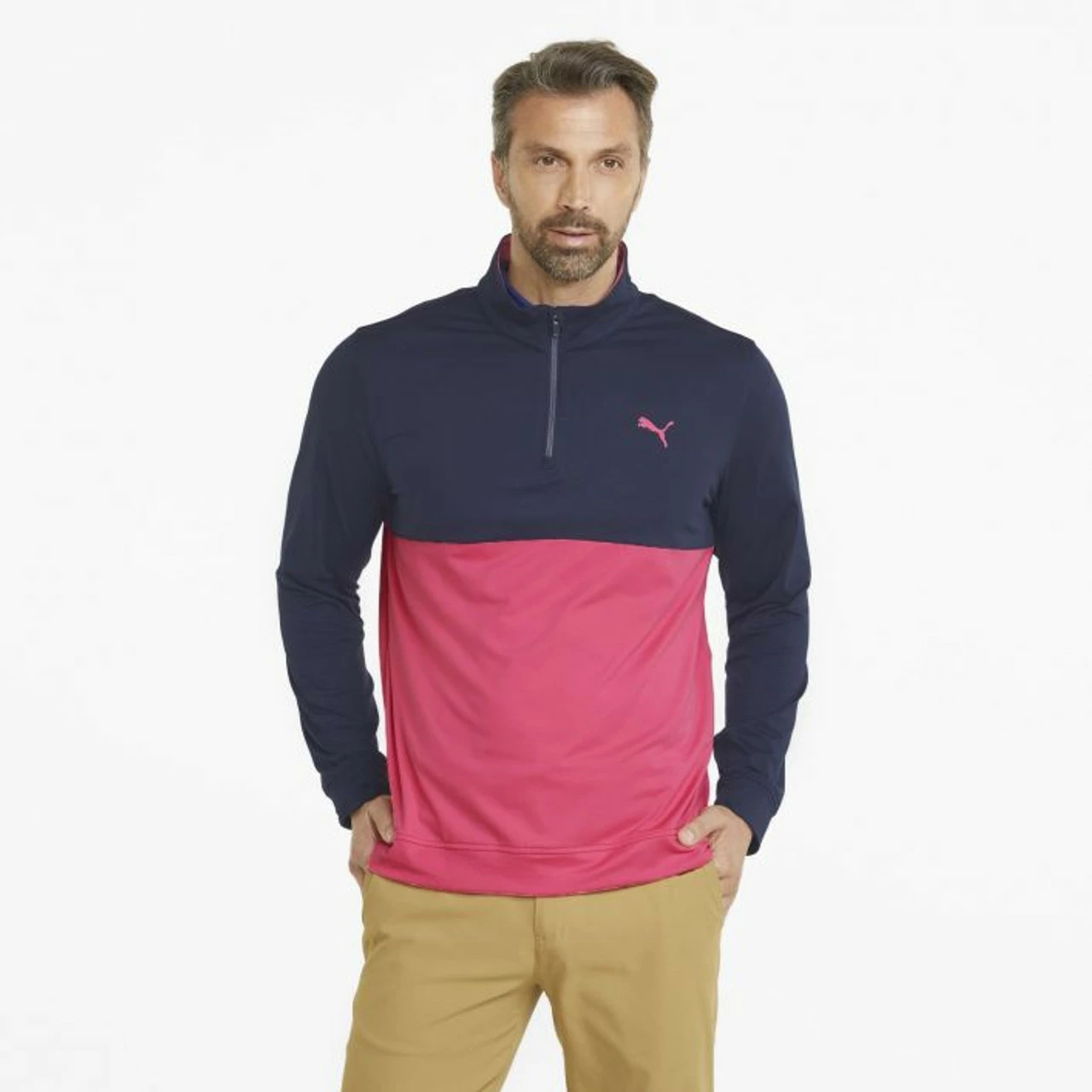 - Basic 1/4 Zip with 2 color chest panel colorblock