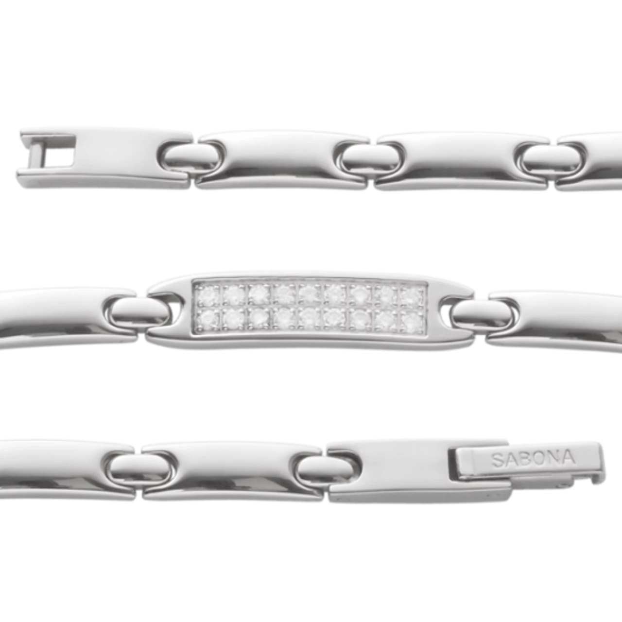 This is truly a new classic for Sabona. This elegant yet simplistic design is crafted out of polished stainless steel accented with 18 clear cubic zirconia gems. This bracelet is like the little black dress every lady needs.
